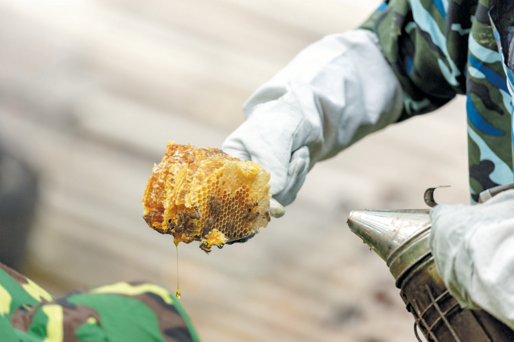 △记者段吉雄(右)体验取蜜过程