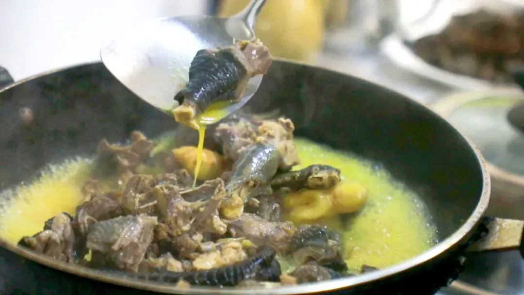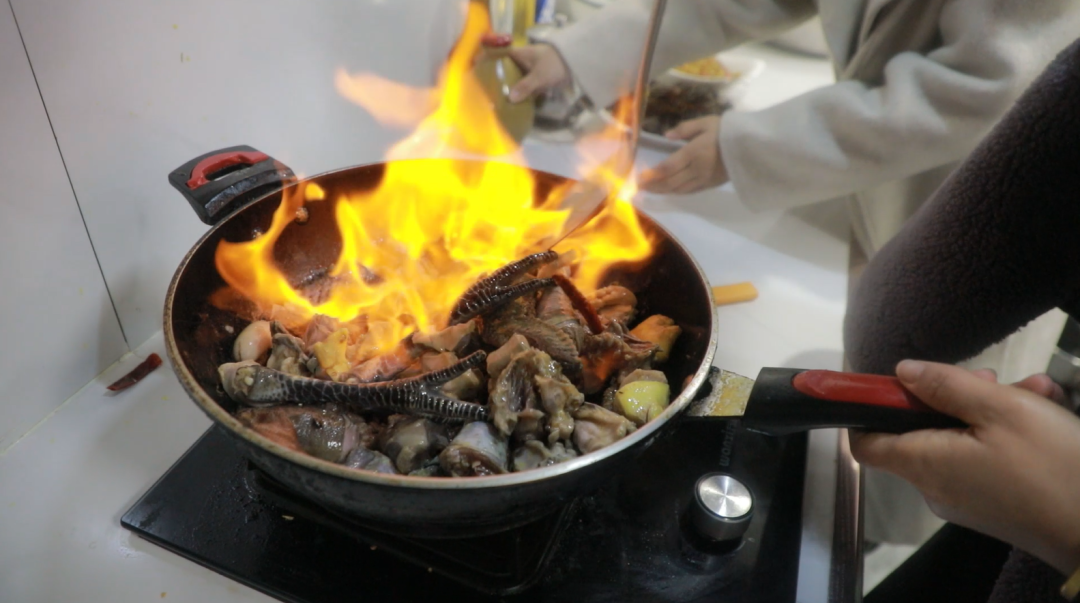 “要用我们竹山本地的菜籽油炒。”吴小娟介绍,将鸡块水分炒干入味后,加入本地的高度粮食酒烧制去腥味,最后再倒入啤酒和开水没过鸡肉,盖上锅盖焖半个小时,这时鸡肉熟透了就可盛出备用。